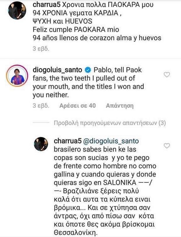 Ο Βραζιλιάνος επιθετικός δεν άφησε να περάσει… αναπάντητο το συγκεκριμένο ποστάρισμα. «Πάμπλο, πες στους φιλάθλους του ΠΑΟΚ για τα δύο δόντια που σου έβγαλα, και για τους τίτλους που κατέκτησα εν αντιθέσει με εσένα» ανέφερε σε σχόλιο του.