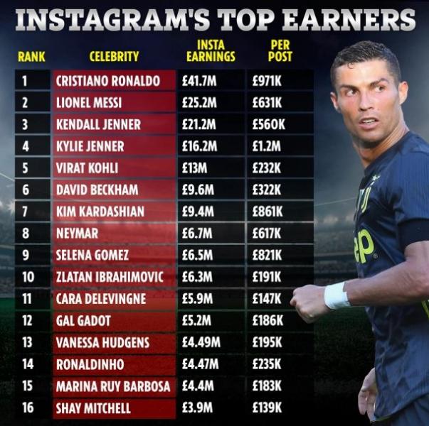Ο Πορτογάλος σταρ της Γιουβέντους είδε από τις 12 Μαρτίου έως και τις 14 Μαΐου να μπαίνουν στο λογαριασμό του 2.110.000 ευρώ, μετά από τις χορηγούμενες δημοσιεύσεις για τους 222 εκατ. ακόλουθους του. Δεύτερος της σχετικής λίστας είναι ο Λιονέλ Μέσι με 151 εκατ. followers και έσοδα 1,5 εκατ. ευρώ ενώ την τριάδα συμπληρώνει ο Νεϊμάρ με 1,3 εκατ. ευρώ.