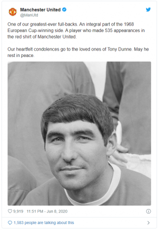 Οι «κόκκινοι διάβολοι» τον αποχαιρέτησαν με μια ανάρτηση στο twitter. «Τα θερμά συλλυπητήρια μας στους αγαπημένους του Τόνι Νταν. Αναπαύσου εν ειρήνη», αναφέρει μεταξύ άλλων στην ανάρτηση του ο αγγλικός σύλλογος.