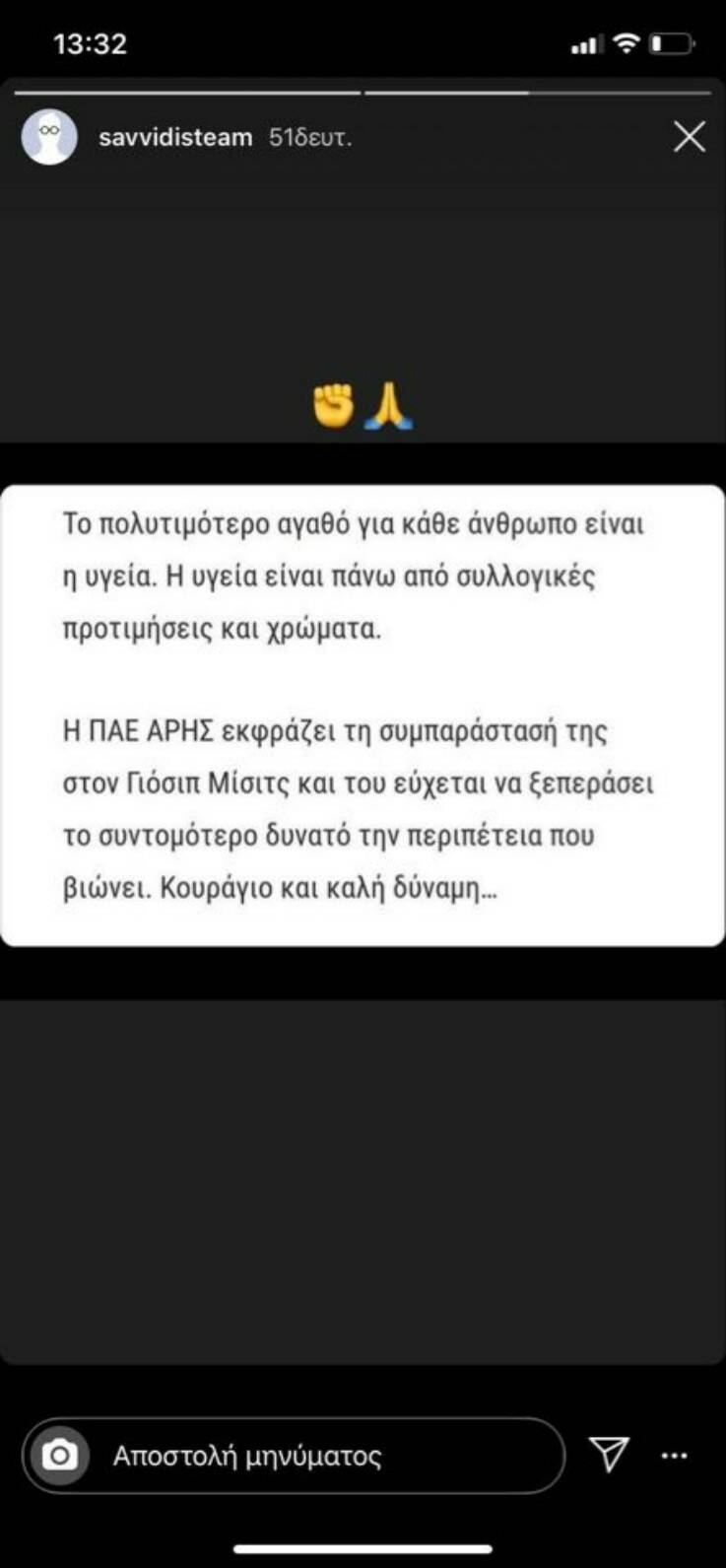 Μέσω των social media ο Γιώργος Σαββίδης ευχαρίστησε τον Άρη για τις ευχές προς τον Γιόσιπ Μίσιτς.