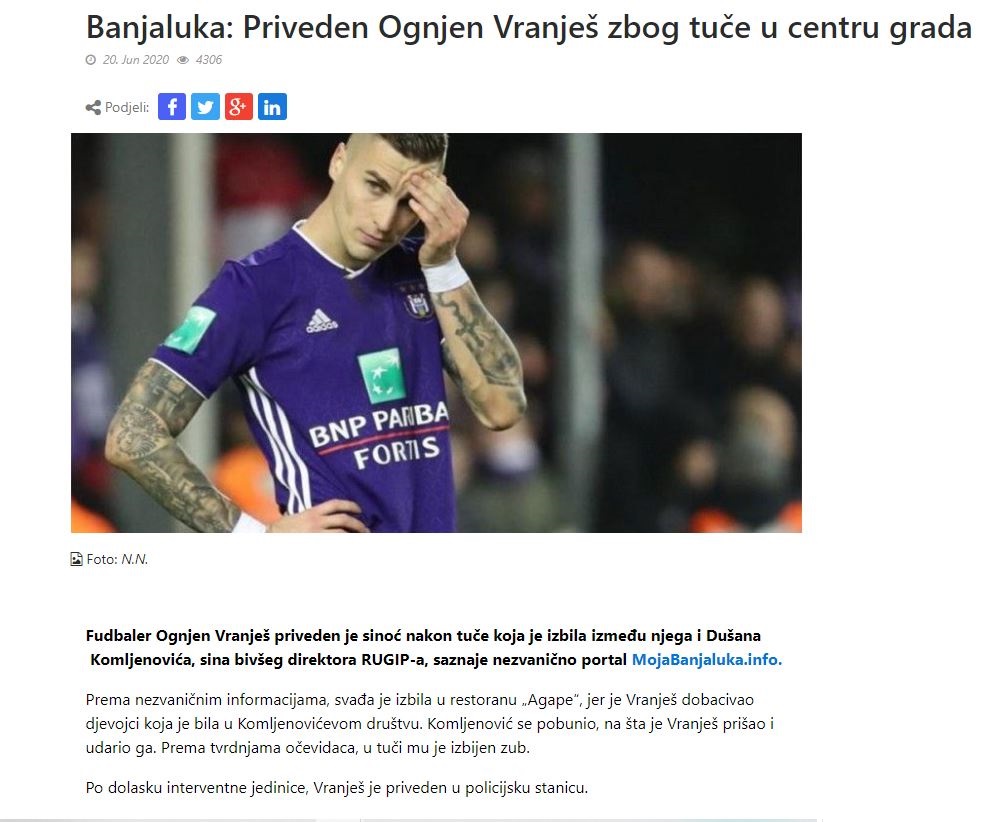 Η διαμάχη φαίνεται πως ξέσπασε σε εστιατόριο όταν ο Ογκνιεν Βράνιες, άρχισε να πετάει προς την κοπέλα του Κομλιένοβιτς, διάφορα αντικείμενα. Ωστόσο, δεν έμεινε εκεί καθώς όπως συνεχίζει το δημοσίευμα ο Κομλιένοβιτς αντέδρασε, ο Βράνιες τον πλησίασε και στη συνέχεια τον χτύπησε ενώ του έσπασε και δόντι.