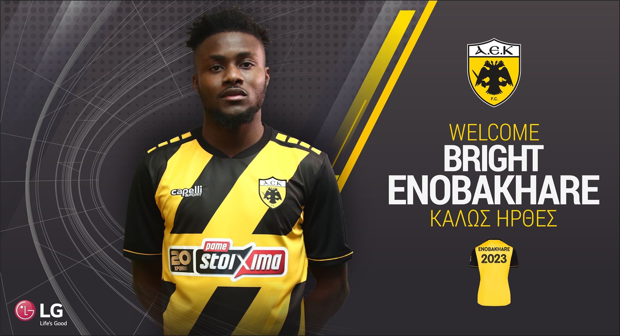 «Η ΠΑΕ ΑΕΚ ανακοινώνει την απόκτηση του Μπράιτ Ενομπακάρε. Ο 22 ετών διεθνής Νιγηριανός επιθετικός υπέγραψε συμβόλαιο συνεργασίας με την ομάδα μας έως το καλοκαίρι του 2023.