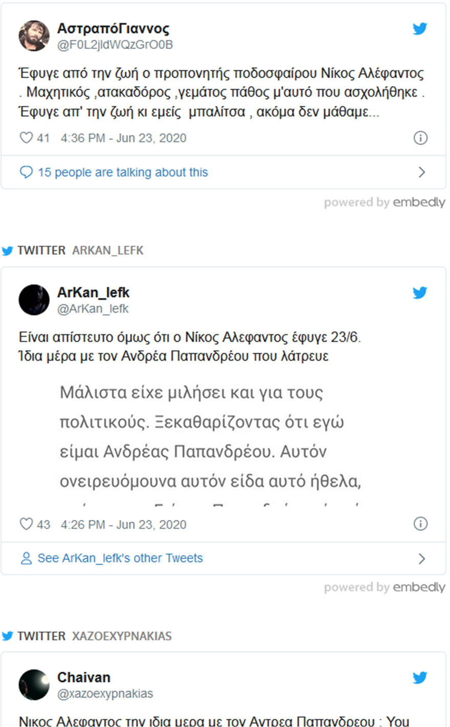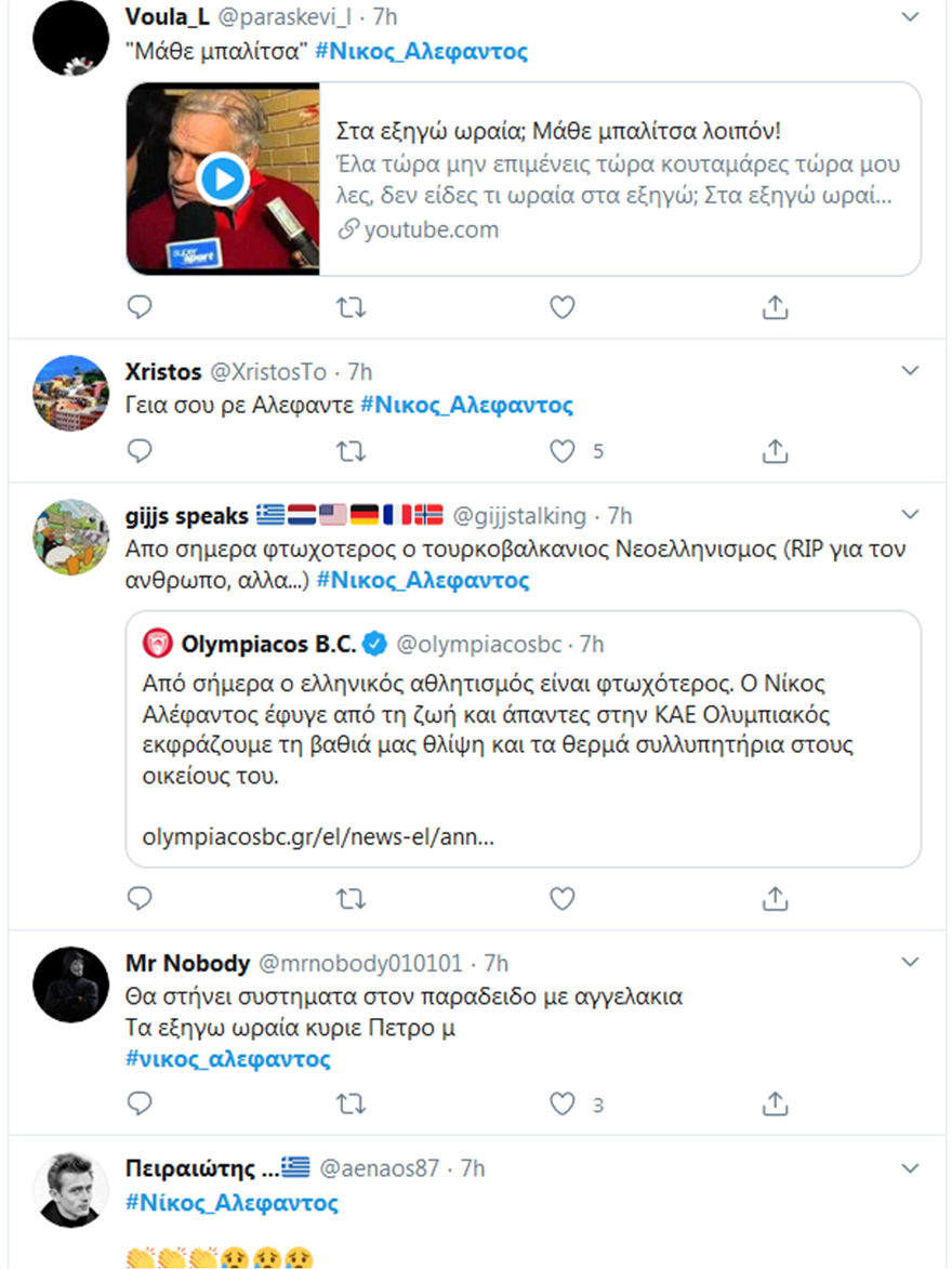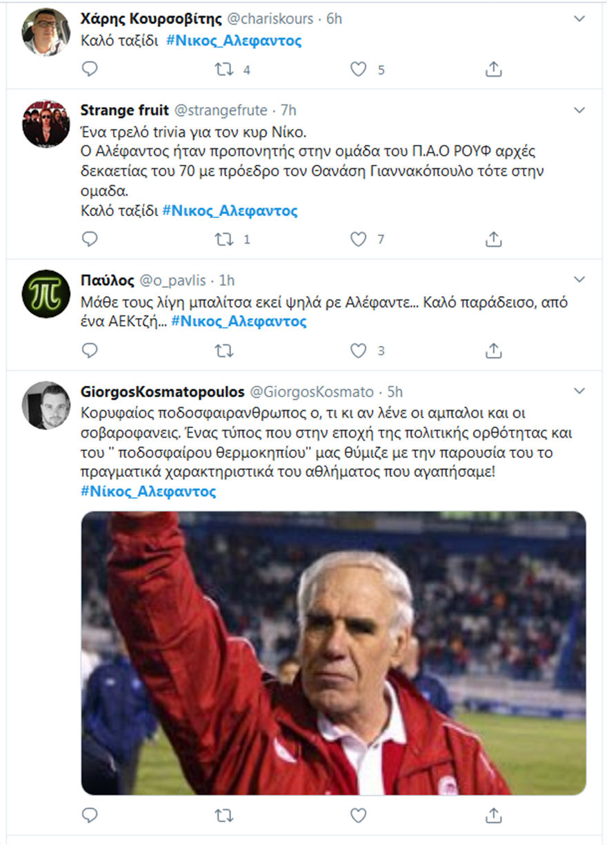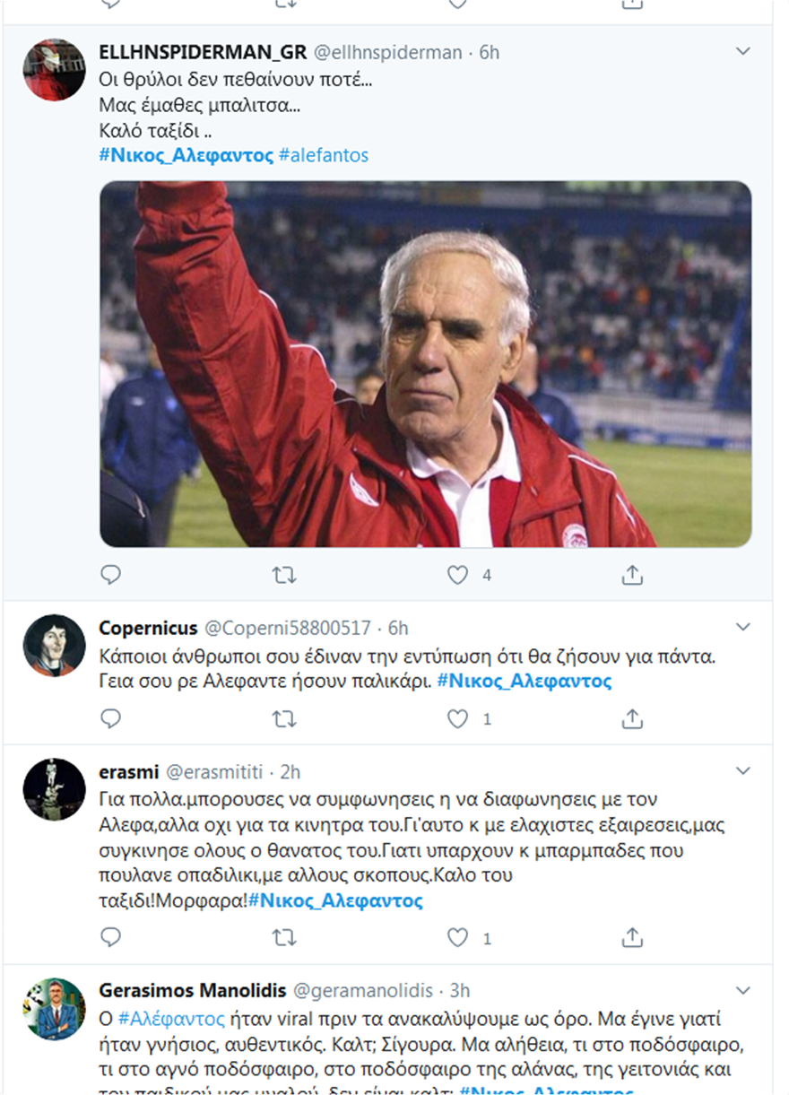 «Βροχή» έπεσαν τα μηνύματα στο twitter, λίγο μετά την είδηση του θανάτου του Νίκου Αλέφαντου, του κυρ Νίκου όπως τον έλεγαν πολλοί.