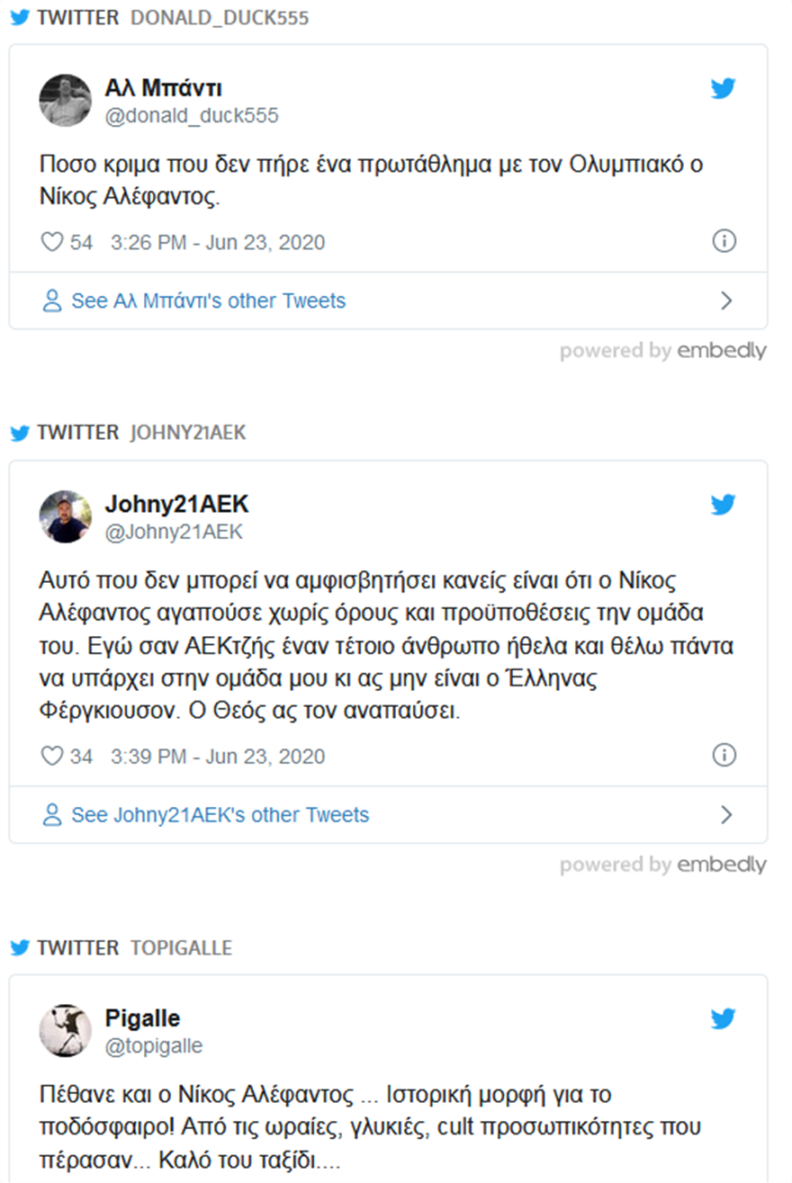 Το ίδιο έπραξαν και οπαδοί ομάδων που ανήρτησαν συγκινητικά μηνύματα για τον Αλέ, ο οποίος έγραψε την δική του πολύ ξεχωριστή ιστορία στο ελληνικό ποδόσφαιρο.