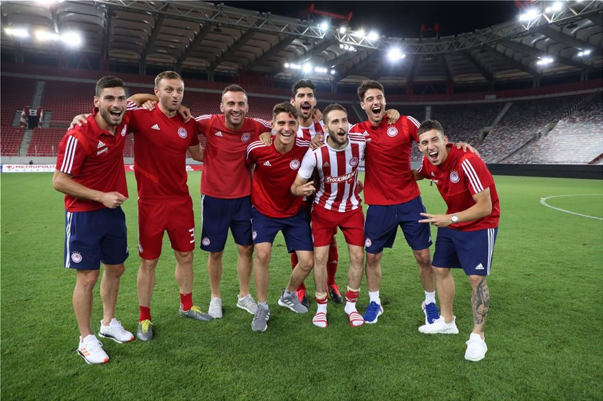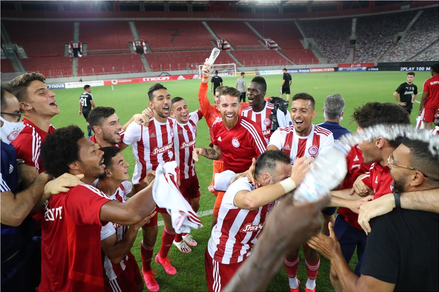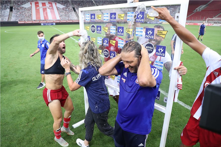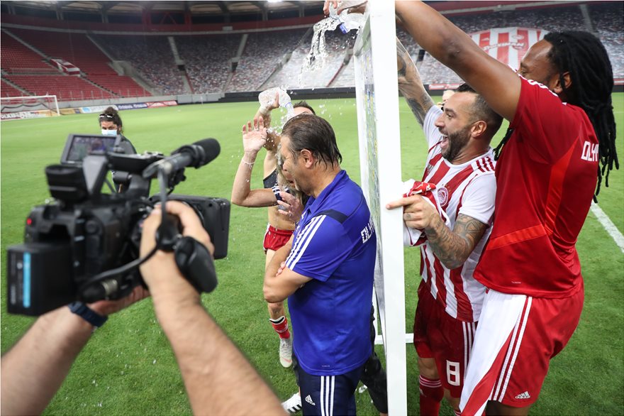 «Είναι κρίμα που ο κόσμος μας δεν είναι εδώ, αλλά τα καταφέραμε και τους κάναμε περήφανους…», είπε ο Πέδρο Μαρτίνς κι ενώ τα παλιόπαιδα οι ποδοσφαιριστές τον είχαν λούσει στην πρώτη απόπειρα των δηλώσεων του με νερό, σαμπάνια κι ότι άλλο βρήκαν μπροστά τους…