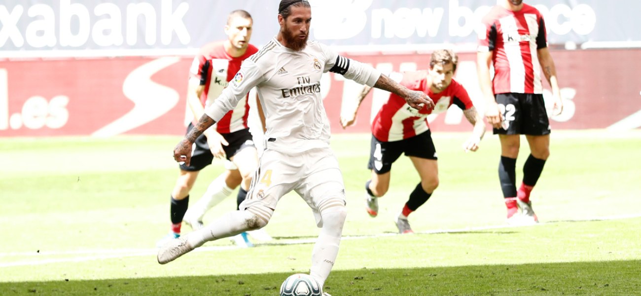 Με τον αγαπημένο της τρόπο η Ρεάλ Μαδρίτης πέρασε με 1-0 στην έδρα της Ατλέτικ Μπιλμπάο, με «χρυσό» σκόρερ τον Σέρχιο Ράμος από την άσπρη βούλα και ξέφυγε 7 βαθμούς από την Μπαρτσελόνα, που έχει και ένα παιχνίδι λιγότερο.