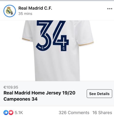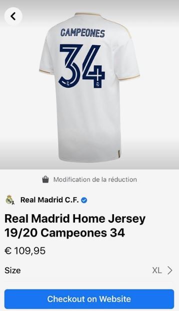 Οι συγκεκριμένες φανέλες, οι οποίες έχουν στο πίσω μέρος την λέξη «Campeones» (πρωταθλητές) και το νούμερο «34», αναρτήθηκαν στο προφίλ της ομάδας σε Facebook και Twitter. Η τιμή της μίας, ανέρχεται στα 105,95 ευρώ, ωστόσο όπως διαπίστωσαν οι φίλοι των «μερένγκες», το ποστ για την πώληση των επετειακών εμφανίσεων, κατέβηκε μετά από λίγες ώρες, από το διαδίκτυο.