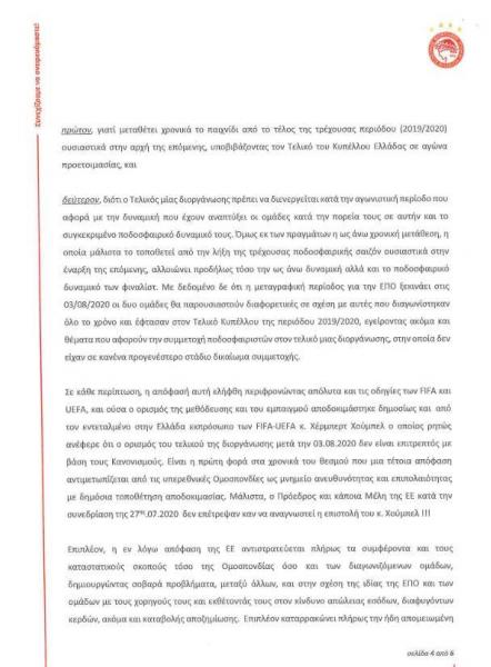 Επίσης, ο Ολυμπιακός τονίζει πως η ΕΠΟ, μέσω αυτής της απόφασής της, αγνόησε τις οδηγίες της FIFA και της UEFA ενώ επικαλείται και τον Χέρμπερτ Χούμπελ λέγοντας πως ο τελευταίος «ρητώς ανέφερε ότι ο ορισμός του τελικού μετά τις 03/08 δεν είναι επιτρεπτός με βάση τους κανονισμούς.