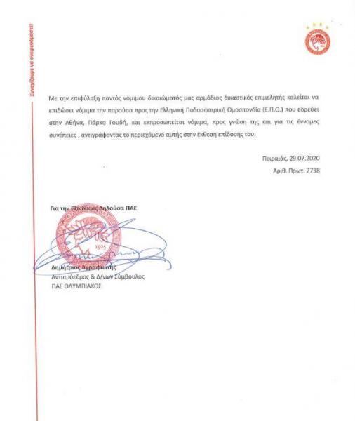 Δείτε το επίμαχο κομμάτι του εξώδικου του Ολυμπιακού: