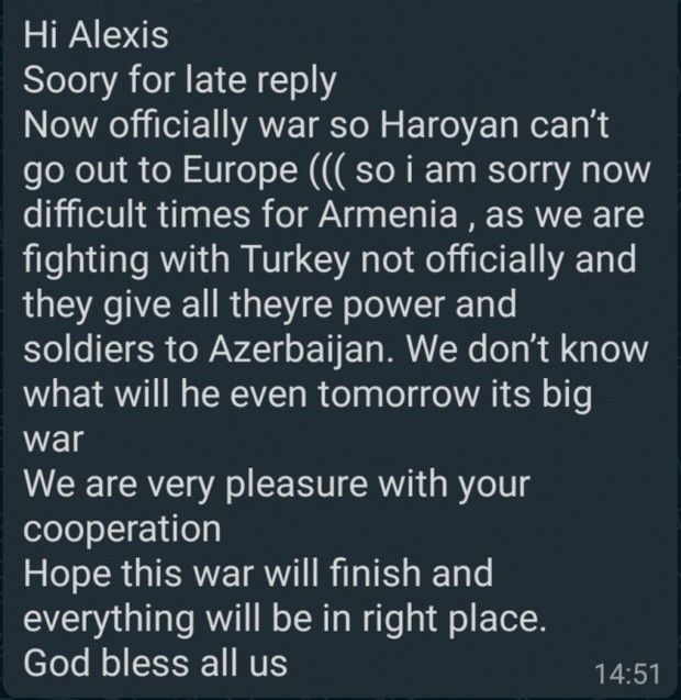 «Πριν από λίγα λεπτά ο μάνατζερ του αρχηγού της Εθνικής Αρμενίας Haroyan μας ενημέρωσε ότι η μεταγραφή του παίκτη στην ΑΕΛ ματαιώνεται, τουλάχιστον για αυτή την μεταγραφική περίοδο, γιατί ο ποδοσφαιριστής όπως και όλοι οι Αρμένιοι πολίτες μέχρι 40 ετών επιστρατεύτηκαν και ήδη ευρίσκεται στο πεδίο των μαχών», αναφέρει χαρακτηριστικά η θεσσαλική ομάδα.