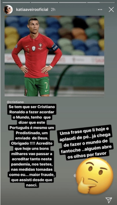 «Αν ο Κριστιάνο πρέπει να ξυπνήσει όλο τον κόσμο, τότε είναι προφήτης σταλμένος από τον Θεό. Ευχαριστώ! Πιστεύω πως χιλιάδες κόσμου πίστεψε στην πανδημία, στα τεστ και στα μέτρα που λήφθηκαν. Ανάμεσά τους κι εγώ. Όμως είναι η μεγαλύτερη απάτη που έχω δει από τότε που γεννήθηκα. Πλέον σήμερα σηκώνομαι να χειροκροτήσω στη φράση: ‘Αρκετά να είμαστε μαριονέτες σε αυτόν τον κόσμο’. Παρακαλώ, ανοίξτε τα μάτια σας», έγραψε η Κάτια Αβέιρο.