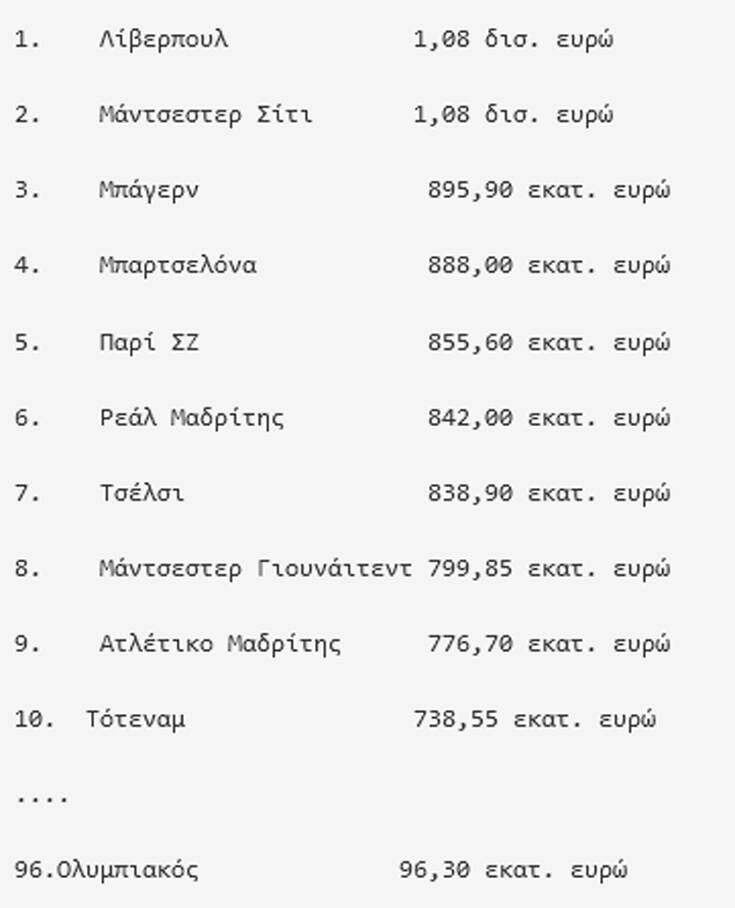Να σημειωθεί ότι οι «κόκκινοι» του Γιούργκεν Κλόπ, αύξησαν την αξία τους, ανεβαίνοντας μία θέση από την προηγούμενη κατάταξη, ενώ αντίθετα υποχώρησε μία θέση η Σίτι του Πεπ Γκουαρντιόλα. Ανέβηκε τρίτη για να συμπληρώσει το βάθρο, η Μπάγερν με αξία 895,70 εκατομμύρια ευρώ. Τα πέντε κορυφαία ευρωπαϊκά πρωταθλήματα κυριαρχούν στην κατάταξη, ενώ οι μισές από τις πρώτες δέκα ομάδες, προέρχονται από την αγγλική Premier League.