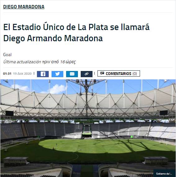Το όνομα του Ντιέγκο Μαραντόνα πήρε το στάδιο της πόλης Λα Πλάτα, στην οποία εργαζόταν μέχρι τον θάνατο του.