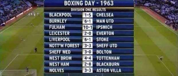 Η Φούλαμ διέλυσε την Ίπσουιτς με 10-1, ενώ η Μπλάκμπερν εκτός έδρας με 8-2 τη Γουέστ Χαμ! Η Λίβερπουλ, που στο τέλος εκείνης της σεζόν θα κατακτούσε το πρωτάθλημα, επιβλήθηκε με 6-1 της Στόουκ στο «Άνφιλντ», ενώ η Μάντσεστερ Γιουνάιτεντ διασύρθηκε με 6-1 στην έδρα της Μπέρνλι! Ήταν πραγματικά η πιο τρελή Boxing Day και πιθανότατα η πιο τρελή αγωνιστική στην ιστορία της πρώτης κατηγορίας στην Αγγλία.