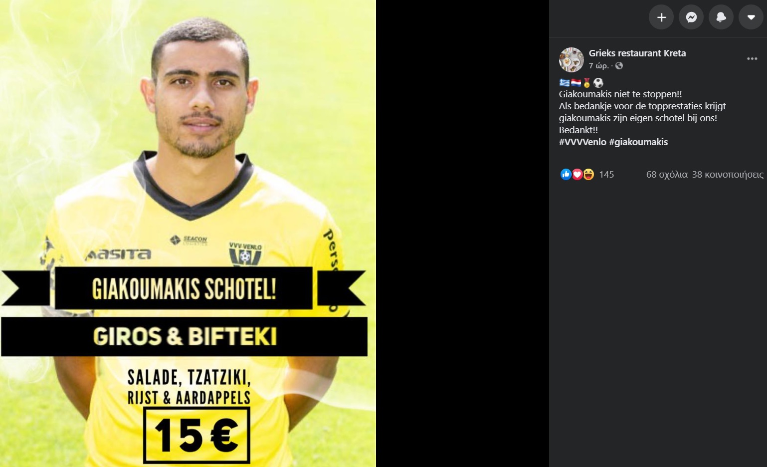 Ένα ελληνικό εστιατόριο που εδρεύει στην Ολλανδία βρήκε τον πιο απολαυστικό τρόπο να εκδηλώσει το θαυμασμό του για τον 26χρονο επιθετικό. Προσέθεσε στο μενού ένα πιάτο με το όνομά του. Το «πιάτο του Γιακουμάκη», που κοστίζει 15 ευρώ, περιλαμβάνει γύρο και μπιφτέκι και συνοδεύεται από τζατζίκι, ρύζι, σαλάτα και πατάτες.