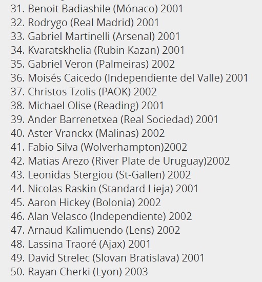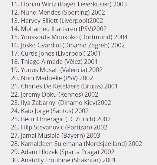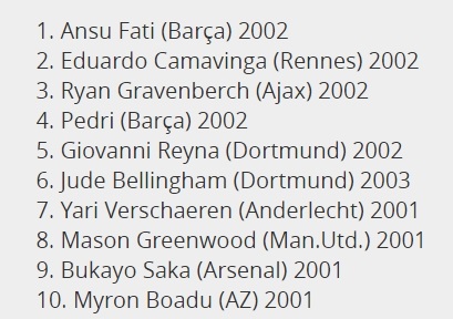 Πρώτος, αξίζει να σημειωθεί, είναι ο Ανσού Φατί της Μπαρτσελόνα, δεύτερος ο Εντουαρντό Καμαβινγκά της Ρεν και τρίτος ο Ράιαν Γκράβενμπερχ του Άγιαξ.