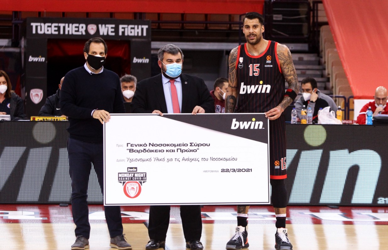 Στο πλαίσιο του bwin Monday Night Against Covid-19 ο Ολυμπιακός αντιμετωπίζει τον Άρη και έτσι στο περιθώριο του αγώνα οι ερυθρόλευκοι έδειξαν ξανά πως στηρίζουν έμπρακτα την κοινωνία. Πιο συγκεκριμένα, ο εκ των αρχηγών του Ολυμπιακού, Γιώργος Πρίντεζης, μαζί με τον Κωνσταντίνο Εφραιμίδη, CSR Manager της bwin, παρέδωσαν στον Διοικητή του Γενικού Νοσοκομείου Σύρου «Βαρδάκειο και Πρώιο», Μιχάλη Ζουλούφο, υγειονομικό υλικό για την κάλυψη των αναγκών του προσωπικού του νοσοκομείου. «Ευχαριστούμε θερμά όλο το προσωπικό του Νοσοκομείου για το τεράστιο έργο και τις προσπάθειες που καταβάλλουν καθημερινά» δήλωσε η ΚΑΕ Ολυμπιακός στα social media.