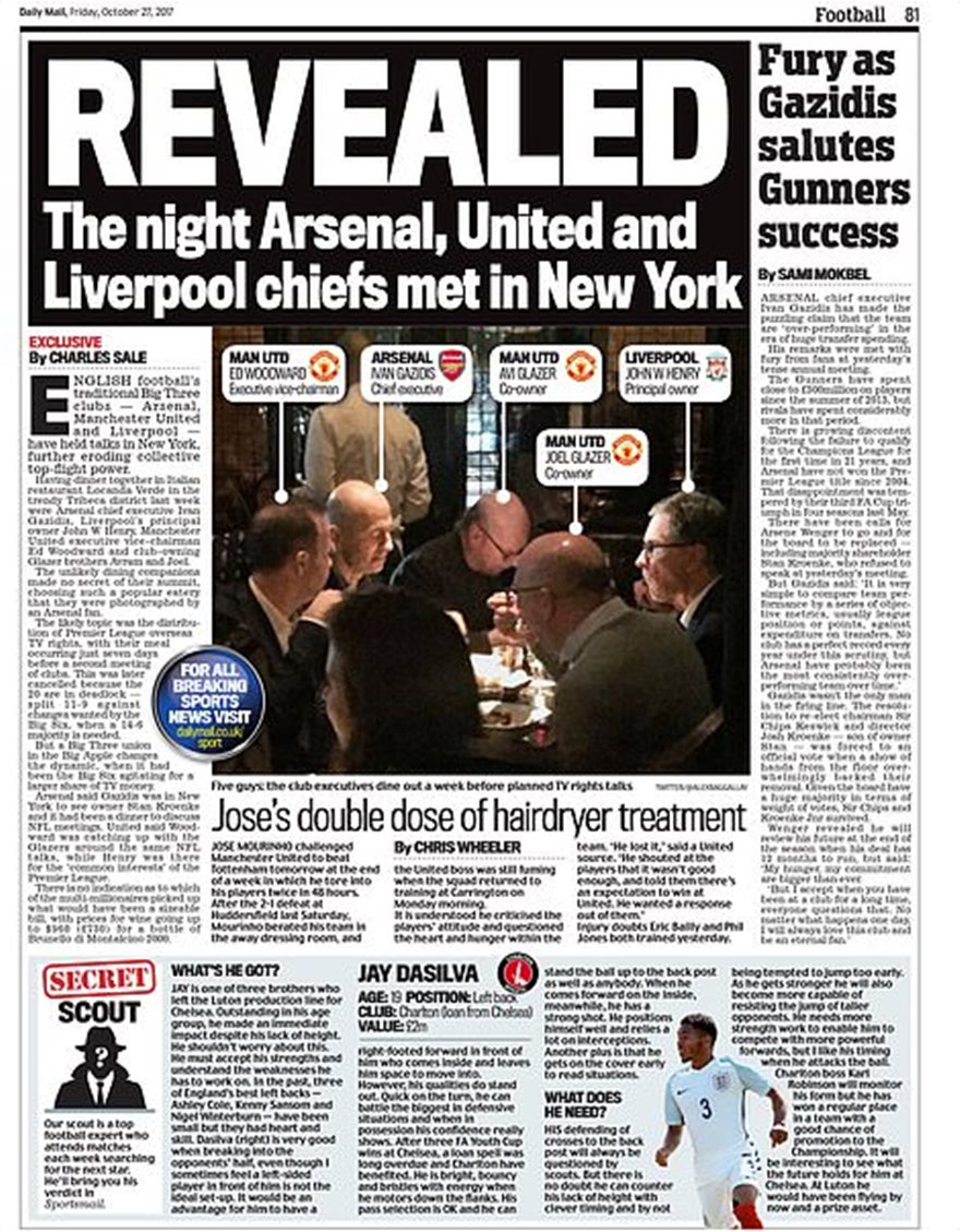Σύμφωνα με δημοσίευμα της Daily Mail, η… συνωμοσία ξεκίνησε να στήνεται περίπου 3,5 χρόνια νωρίτερα, σε έναν «μυστικό δείπνο» με τη συμμετοχή των ισχυρών ανδρών της Λίβερπουλ, της Μάντσεστερ Γιουνάιτεντ, της Άρσεναλ και της Μίλαν. Ήταν Οκτώβριος του 2017, όταν ο ιδιοκτήτης της Λίβερπουλ, Τζον Χένρι, ο τότε διευθύνων σύμβουλος της Άρσεναλ και μετέπειτα εκτελεστικός διευθυντής στη Μίλαν, Ιβάν Γκαζίδης, καθώς και οι ιδιοκτήτες της Μάντσεστερ Γιουνάιτεντ, αδερφοί Γκλέιζερ, μαζί με τον εκτελεστικό αντιπρόεδρο του συλλόγου, Εντ Γούντγουορντ, συναντήθηκαν για συζητήσεις σε ένα από τα πιο φημισμένα εστιατόρια της Νέας Υόρκης -το ιταλικό «Locanda Verde».