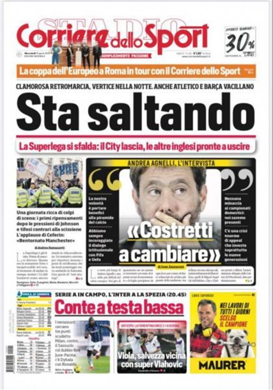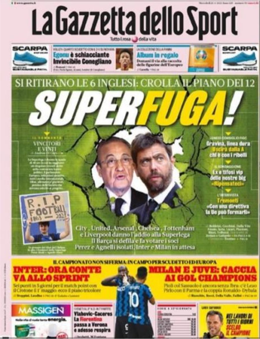 Αργά χθες το βράδυ η διοργανώτρια αρχή ανακοίνωσε πως αναβάλλονται τα σχέδιά της και σήμερα σύσσωμος ο ευρωπαϊκός Τύπος πανηγυρίζει για τη συγκεκριμένη εξέλιξη, στην οποία έπαιξε σημαντικό ρόλο το κίνημα κατά των ισχυρών του ευρωπαϊκού/παγκόσμιου ποδοσφαίρου.