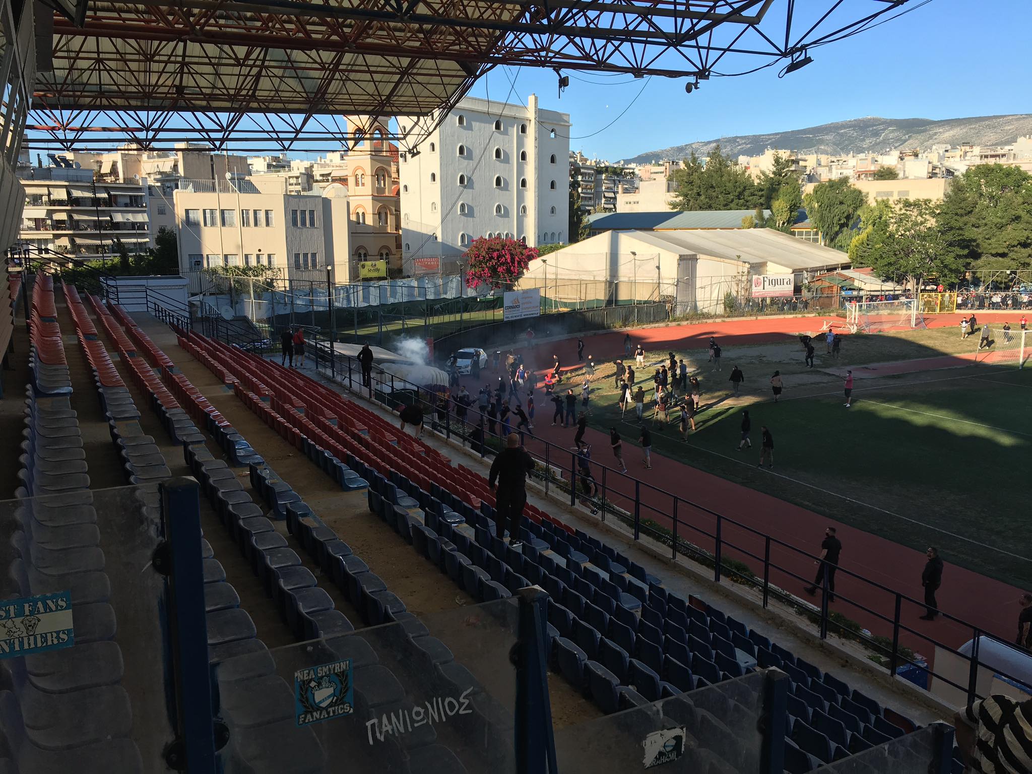 Η κατάσταση πήγε να ξεφύγει και μόλις τελείωσε ο αγώνας, με τους φίλους του Πανιωνίου να μπαίνουν στο γήπεδο και να κινούνται προς αυτούς της Ηλιούπολης (συνοδεία ομάδας γιατί απαγορεύονται οι μετακινήσεις). Υπήρξαν αντεγκλήσεις και ρίψεις αντικειμένων με την αστυνομία να πετάει κρότου λάμψης προκειμένου η κατάσταση να μην ξεφύγει.
