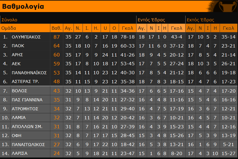 Ο Ολυμπιακός νίκησε τον ΠΑΟΚ, με τον Δικέφαλο του Βορρά ωστόσο να καπαρώνει και τυπικά τη 2η θέση, καθώς ο Άρης έμεινε στο 0-0 με τον Παναθηναϊκό.