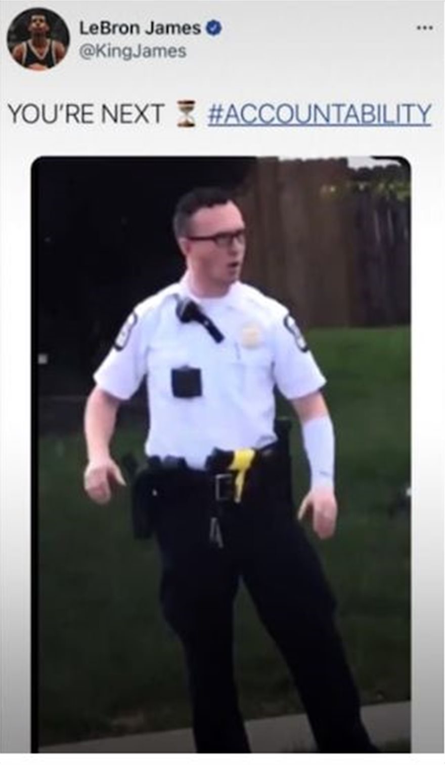 Στην εν λόγω δημοσίευση, ο Λεμπρόν έγραψε πάνω από τη φωτογραφία του αστυνομικού, που πυροβόλησε τη 16χρονη: «Είσαι ο επόμενος». Ο μπασκετμπολίστας διέγραψε το tweet τον προηγούμενο μήνα.