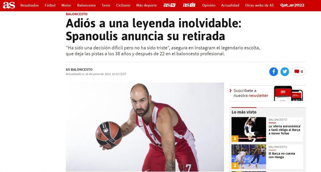 AS: «Το αντίο ενός θρύλου: Ο Σπανούλης ανακοινώνει την απόσυρσή του».