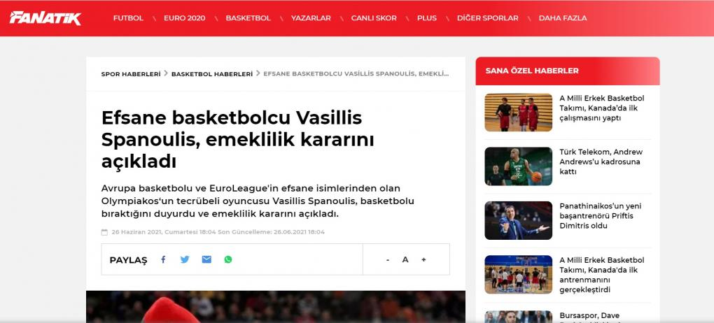 Fanatik: «Ο θρυλικός παίκτης Βασίλης Σπανούλης ανακοίνωσε την απόφασή του να αποσυρθεί»