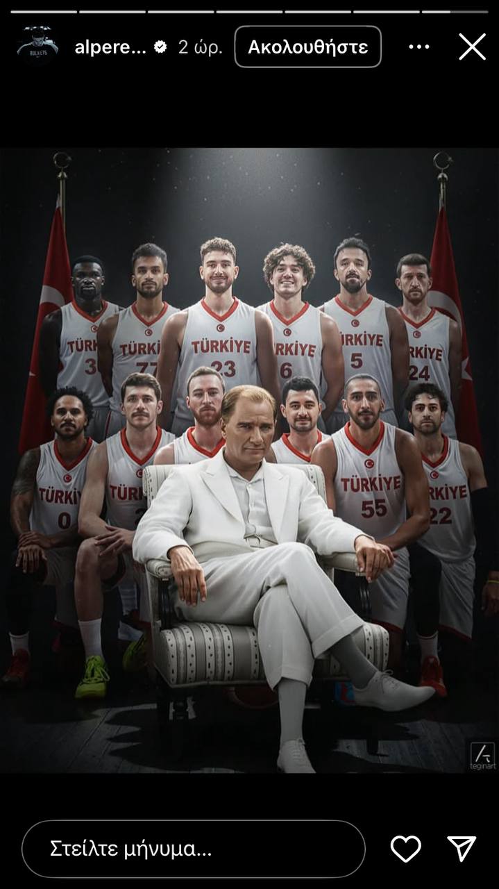 Μάλιστα, ο Τούρκος ΝΒΑερ είχε δημοσιεύσει νωρίτερα και μια φωτογραφία η οποία απεικονίζει εκείνον και τους συμπαίκτες του μαζί με τον Κεμάλ Ατατούρκ.