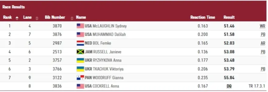 Αρκετά εντυπωσιακή ήταν η Σίντνεϊ ΜακΛάφλιν, καθώς πέρα από την κατάκτηση του χρυσού μεταλλίου στο στίβο στους Ολυμπιακούς Αγώνες στο Τόκιο και συγκεκριμένα στα 400 μέτρα με εμπόδια, έσπασε και το δικό της παγκόσμιο ρεκόρ, καθώς έκανε 51.46.