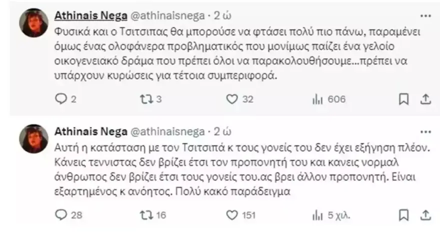 Η Αθηναΐς Νέγκα, με ανάρτησή της στα μέσα κοινωνικής δικτύωσης, αναφέρθηκε στον Στέφανο Τσιτσιπά τονίζοντας πως «κανείς νορμάλ άνθρωπος δεν βρίζει έτσι τους γονείς του».