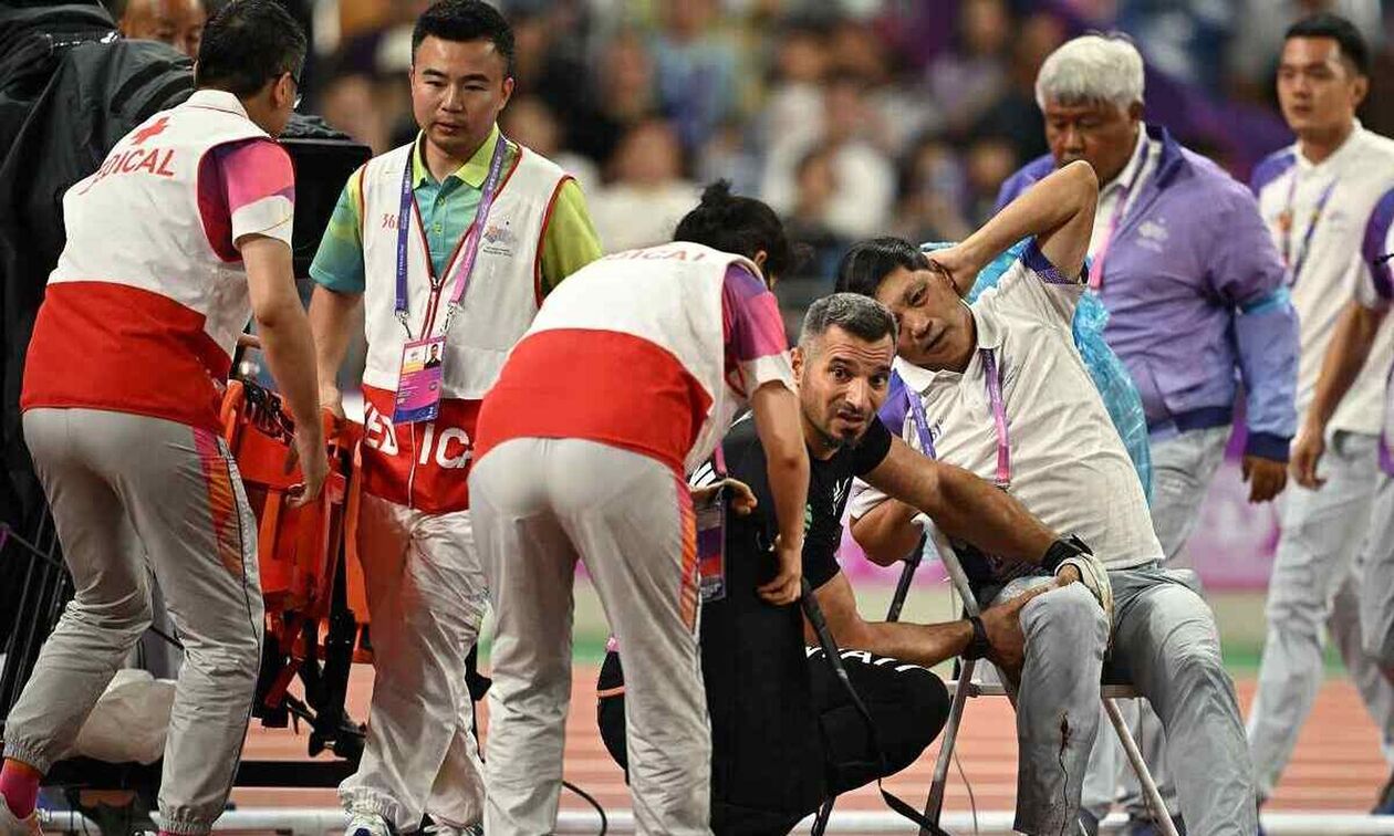Sędzia techniczny zawodów rzutu młotem Azjatyckich IO doznał poważnych obrażeń nogi po tym, jak reprezentant Kuwejtu Ali Zankawi wypuścił młot w siatkę ochronną. Zawodnik podbiegł natychmiast do sędziego i próbował zatamować krwotok. Chińczyk ma złamaną nogę i przejdzie operację pic.twitter.com/qb7nx0viK9