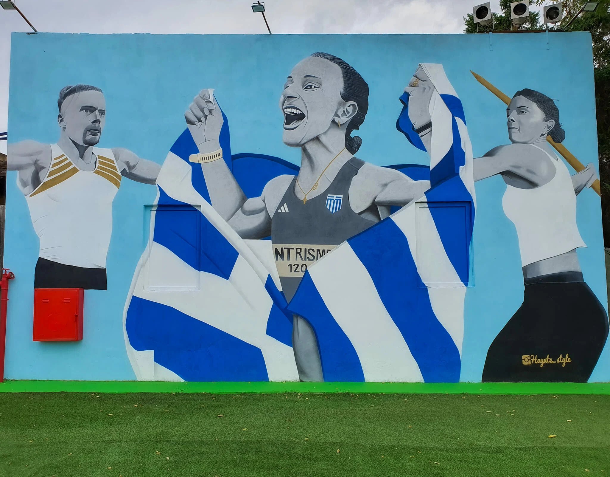 Στο τεράστιο mural graffiti απεικονίζεται η Αντιγόνη Ντρισμπιώτη την στιγμή που πανηγυρίζει αυθόρμητα με την ελληνική σημαία αμέσως μετά την κατάκτηση του δεύτερου χρυσού μεταλλίου στο Μόναχο στα 35 χιλιόμετρα. Αριστερά ο Λευτέρης Πετρούνιας στους κρίκους και δεξιά η Ελίνα Τζένγκο όταν με την βολή της στο ακόντιο κατέκτησε το χρυσό μετάλλιο στο Ευρωπαϊκό Πρωτάθλημα Στίβου 2022.