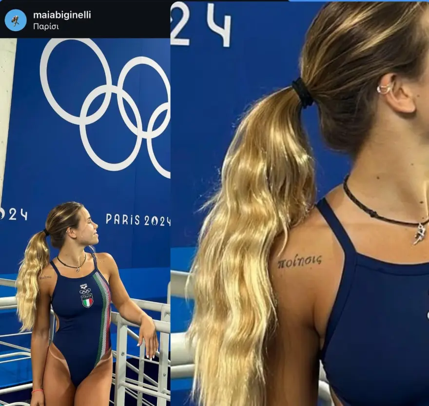 Η 21χρονη Ιταλίδα καταδύστρια Μάια Μπιτζινέλι, τράβηξε τα βλέμματα των Ελλήνων… φίλων του αθλήματος στους Ολυμπιακούς Αγώνες, καθώς στον δεξιό της ώμο φιγουράρει ένα τατουάζ στα ελληνικά.