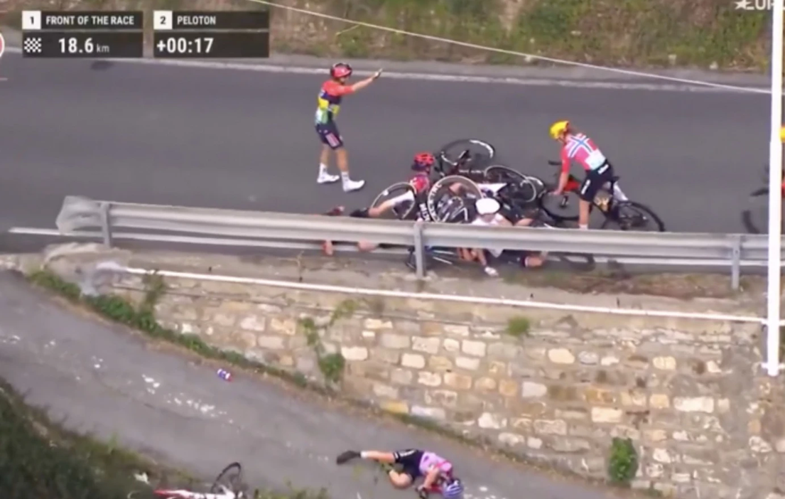 Στην προσπάθειά της να αποφύγει τα πεσμένα ποδήλατα και τις συναθλήτριές της, η Ιταλίδα ποδηλάτισσα έχασε τον έλεγχο, με αποτέλεσμα να εκτοξευθεί εκτός δρόμου και να περάσει πάνω από τις προστατευτικές μπαριέρες, πέφτοντας από μεγάλο ύψος.
