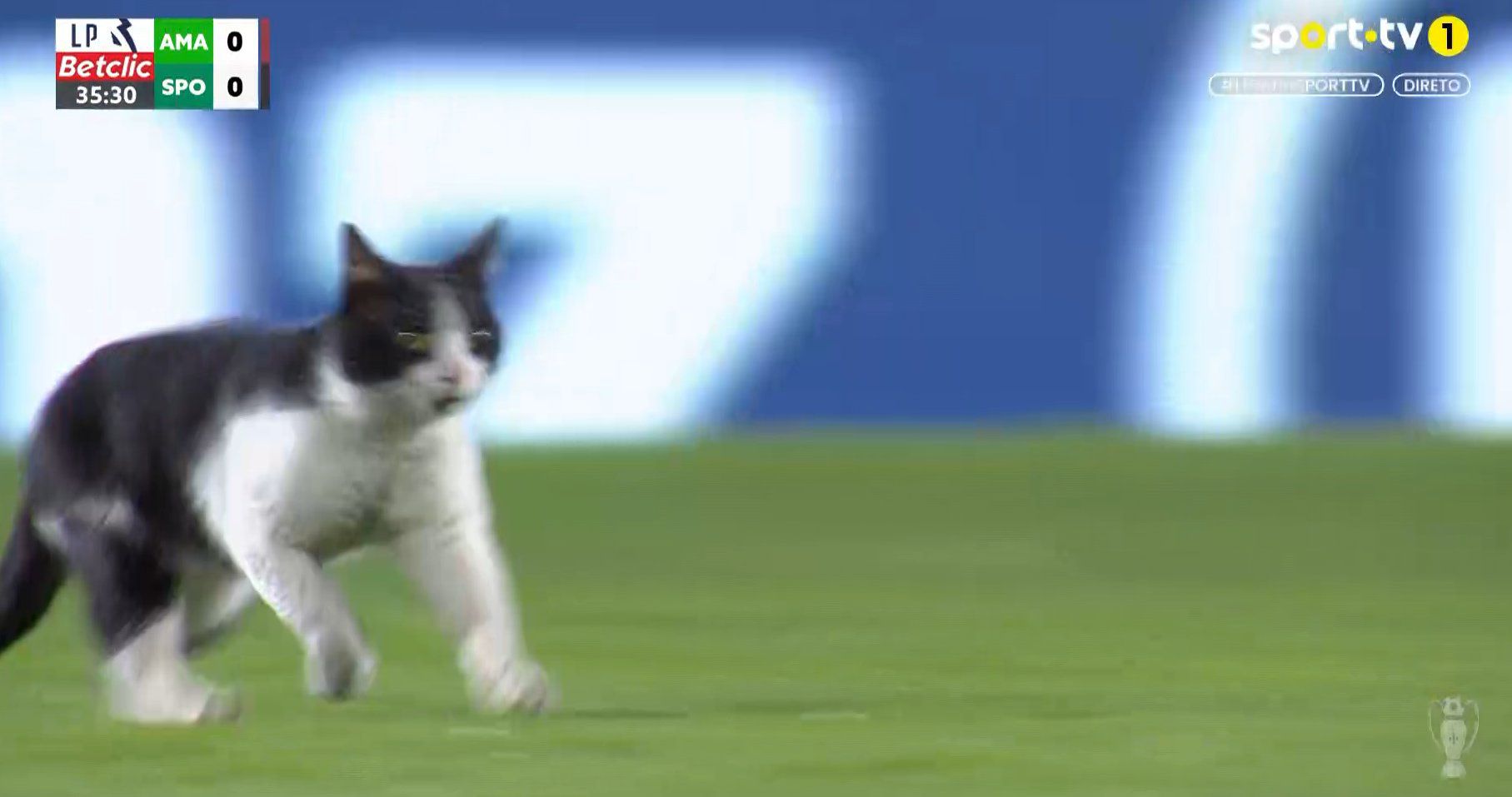 Ένα απρόοπτο αλλά και χιουμοριστικό στιγμιότυπο σημειώθηκε σε αγώνα στην Πορτογαλία, όταν μια… γάτα διέκοψε προσωρινά την αναμέτρηση μεταξύ της Εστρέλα Αμαδόρα και της Σπόρτινγκ Λισαβόνας.