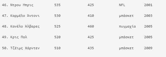 Η έρευνα της Sportico συμπεριέλαβε τα κέρδη κατά τη διάρκεια της καριέρας μέχρι το 2022 και τα προσάρμοσε με τον πληθωρισμό. Τα κέρδη υπολογίζονται μέχρι τη στιγμή του θανάτου για τους Άρνολντ Πάλμερ και Κόμπι Μπράιαντ.