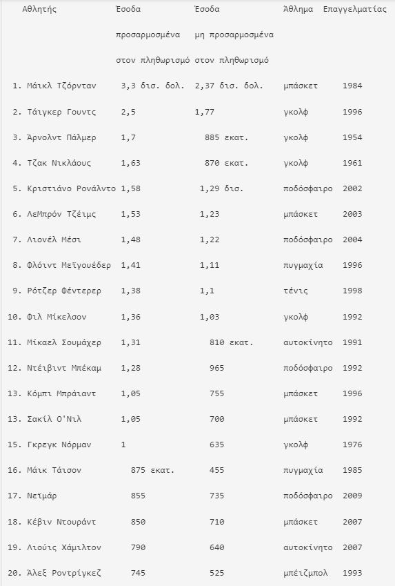 Η έρευνα της Sportico συμπεριέλαβε τα κέρδη κατά τη διάρκεια της καριέρας μέχρι το 2022 και τα προσάρμοσε με τον πληθωρισμό. Τα κέρδη υπολογίζονται μέχρι τη στιγμή του θανάτου για τους Άρνολντ Πάλμερ και Κόμπι Μπράιαντ.