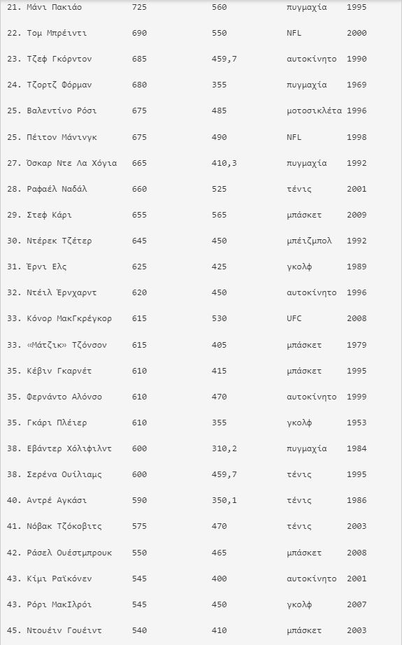 Η Σερένα Ουίλιαμς είναι η μόνη γυναίκα που βρίσκεται στο Top 50 και συγκεκριμένα στο Νο 38 με 600 εκατομμύρια δολάρια. Η κάτοχος 23 τίτλων Grand Slam στο μονό είναι η ηγέτιδα όλων των εποχών με χρηματικά έπαθλα 95 εκατομμυρίων δολαρίων στην WTA, αλλά έχει κερδίσει το μεγαλύτερο μέρος του εισοδήματός της εκτός κορτ μέσω δεκάδων συμφωνιών, συμπεριλαμβανομένων εκείνων με τις Nike, AT&T, Beats, Ford Motor, Gatorade και Subway. Η Ουίλιαμς κατέλαβε πέρυσι τη δεύτερη θέση μεταξύ των πιο ακριβοπληρωμένων αθλητριών στον κόσμο με 35 εκατομμύρια δολάρια, πίσω από τη Ναόμι Οσάκα (53 εκατομμύρια δολάρια).