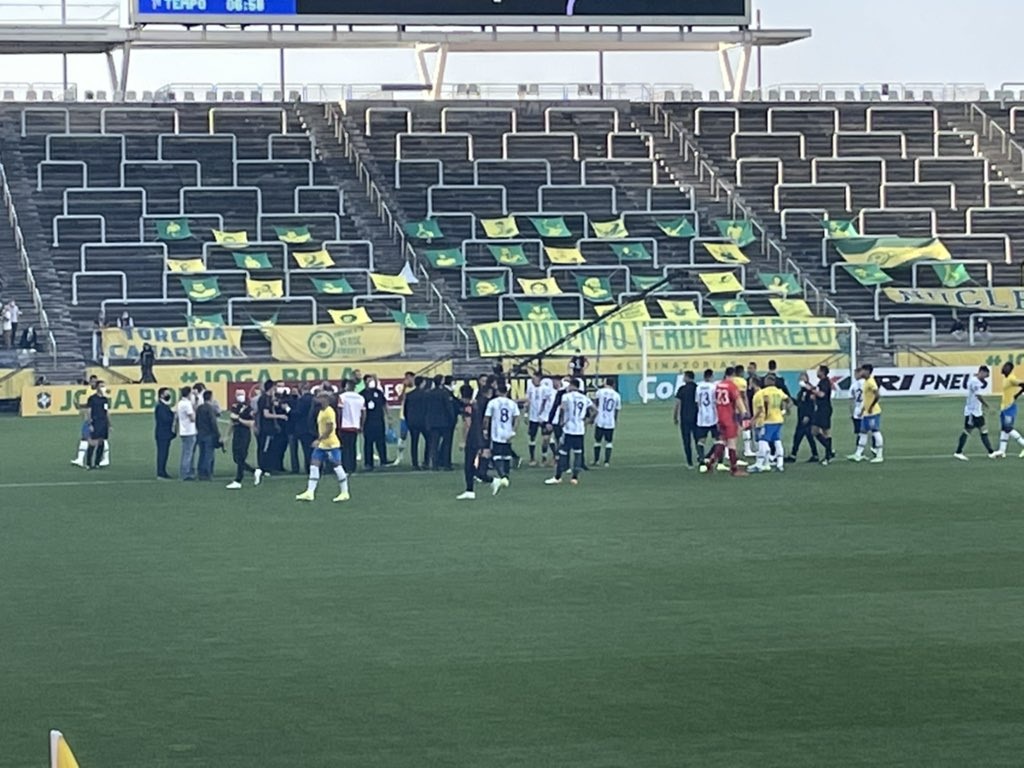 Χαμός στην αναμέτρηση της Βραζιλίας με την Αργεντινή, η οποία διακόπηκε στο 6ο λεπτό, όταν η αστυνομία εισέβαλε στο γήπεδο για να βγάλει από τον αγωνιστικό χώρα τέσσερις παίκτες των φιλοξενούμενων.