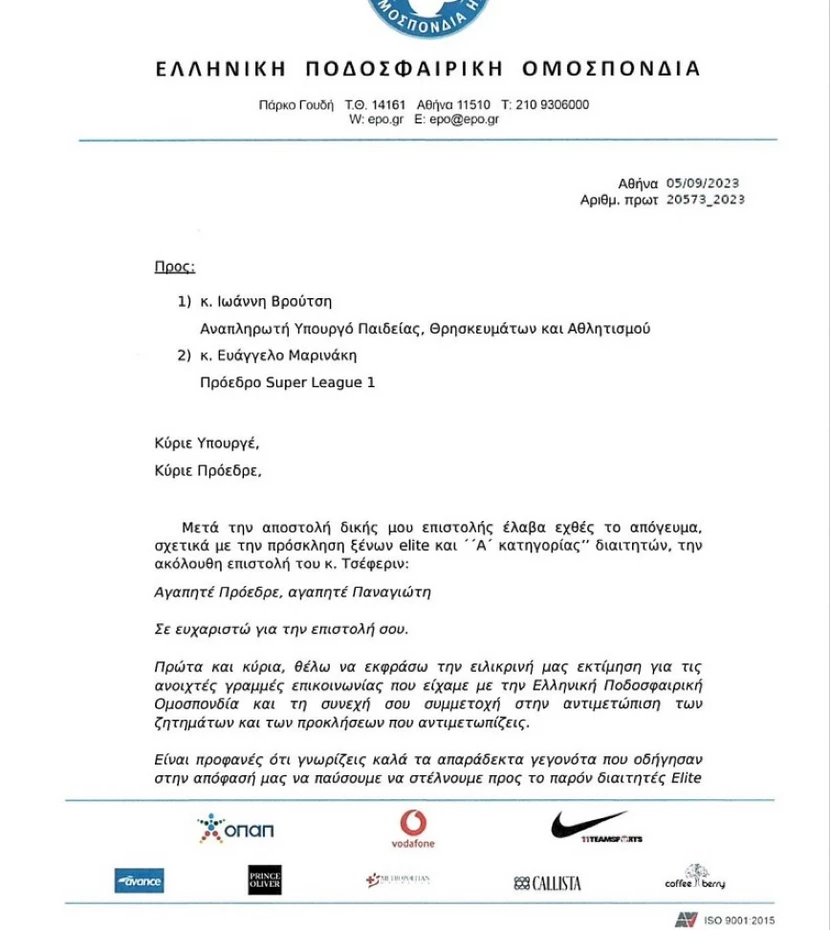Ο πρόεδρος της ΕΠΟ έστειλε επιστολή στον αναπληρωτή υπουργό Αθλητισμού, Γιάννη Βρούτση, και στον πρόεδρο της Stoiximan Super League, Βαγγέλη Μαρινάκη, στην οποία υπήρχε και το περιεχόμενο αυτής του προέδρου της UEFA και το οποίο είναι το εξής.