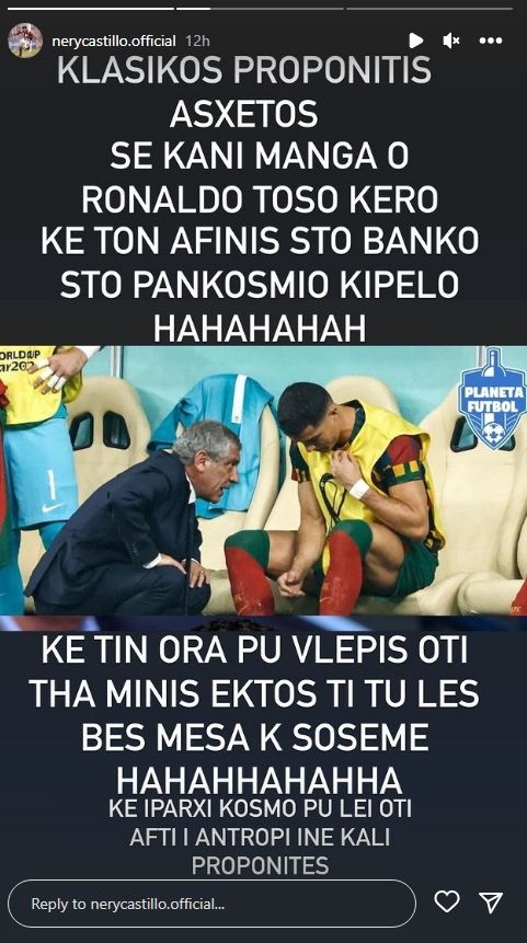 Κλασικός προπονητής άσχετος, σε κάνει μάγκα ο Ρονάλντο τόσο καιρό και τον αφήνεις στον πάγκο στο Παγκόσμιο Κύπελλο χαχαχα. Και την ώρα που βλέπεις ότι θα μείνεις εκτός τι του λες; Μπες μέσα και σώσε με; Χαχαχα. Και υπάρχει κόσμος που λέει ότι αυτοί οι άνθρωποι είναι καλοί προπονητές”, έγραψε στα δύο του story ο Νέρι Καστίγιο.