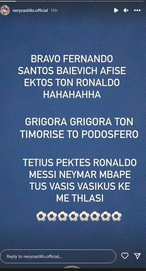 Κλασικός προπονητής άσχετος, σε κάνει μάγκα ο Ρονάλντο τόσο καιρό και τον αφήνεις στον πάγκο στο Παγκόσμιο Κύπελλο χαχαχα. Και την ώρα που βλέπεις ότι θα μείνεις εκτός τι του λες; Μπες μέσα και σώσε με; Χαχαχα. Και υπάρχει κόσμος που λέει ότι αυτοί οι άνθρωποι είναι καλοί προπονητές”, έγραψε στα δύο του story ο Νέρι Καστίγιο.