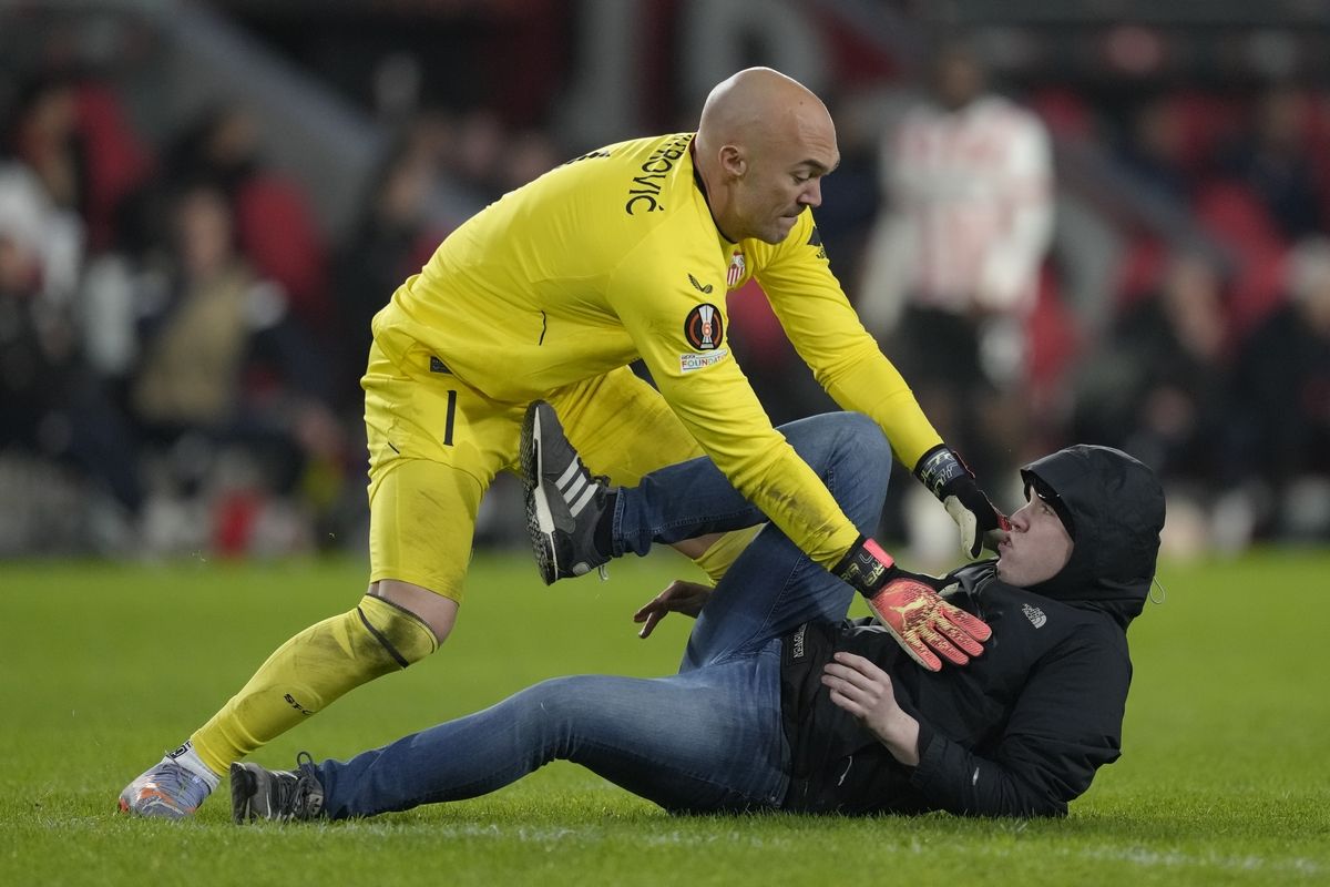 Οπαδός της Αϊντχόφεν έκανε το… λάθος να εισβάλει στον αγωνιστικό χώρο του «Philips Stadion» και να επιτεθεί στον τερματοφύλακα της Σεβίλλης, Μάρκο Ντμιτρόβιτς, ο οποίος τον… ξάπλωσε και ήταν τυχερός που οι άνθρωποι της ασφάλειας τον έσωσαν από τα χέρια του.