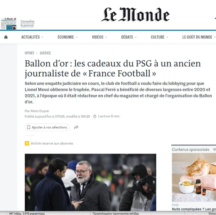 Τα γαλλικά ΜΜΕ υποστηρίζουν ότι η Παρί Σεν Ζερμέν βρίσκεται υπό δικαστική έρευνα για πιθανό «στήσιμο» της 7ης Χρυσής Μπάλας του Λιονέλ Μέσι.