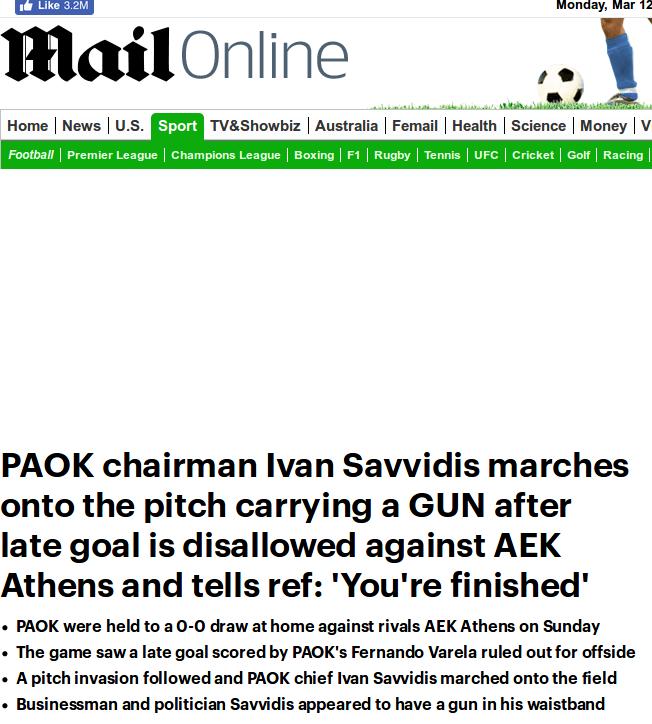 Ενώ η Daily Mail στέκεται και στην απειλή «Είσαι τελειωμένος ως διαιτητής», που φέρεται να εκστόμισε ο πρόεδρος του ΠΑΟΚ προς τον ρέφερι του αγώνα