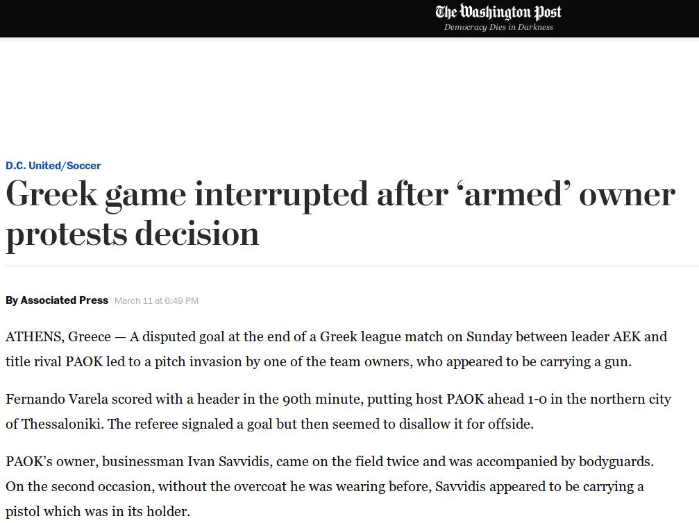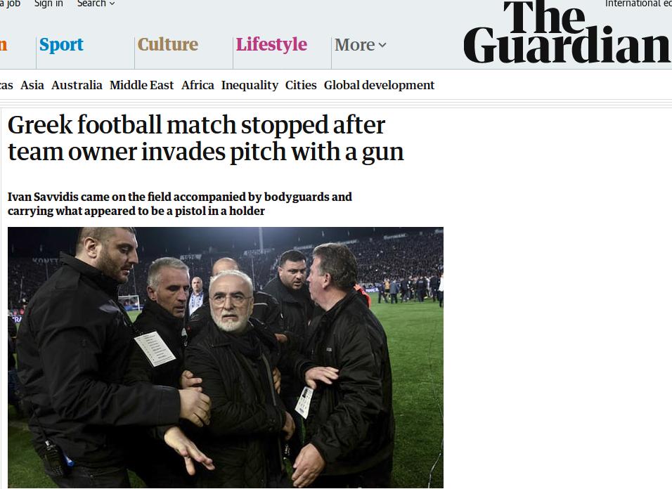 H βρετανική εφημερίδα The Guardian έχει τίτλο «Ελληνικό ποδοσφαιρικό παιχνίδι διεκόπη, όταν εισέβαλε ιδιοκτήτης ομάδας με όπλο στον αγωνιστικό χώρο».