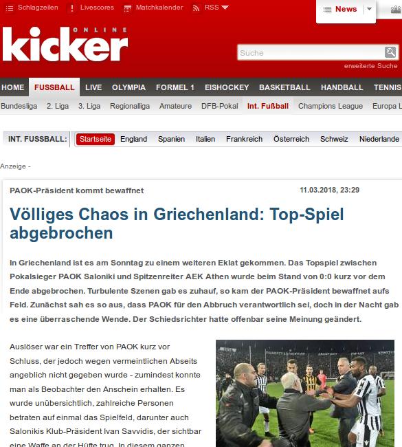Το γερμανικό Kicker σχολιάζει: «Απόλυτο χάος στην Ελλάδα- διεκόπη κορυφαίο παιχνίδι» και στον υπέρτιτλο αναφέρει: «Ο πρόεδρος του ΠΑΟΚ έρχεται οπλισμένος».