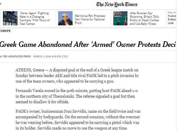 Το αμερικανικό δίκτυο ΑΒC αναμεταδίδει τηλεγράφημα του Associated Press με τίτλο «Ελληνικός αγώνας διεκόπη μετά την διαμαρτυρία “ενόπλου” ιδιοκτήτη», ενώ τον ίδιο τίτλο έχουν και δύο από τις κορυφαίες εφημερίδες των ΗΠΑ, η Washington Post και οι New York Times.’
