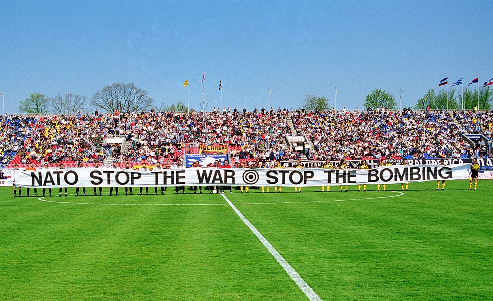 Οι 22 παίκτες μπήκαν στο γήπεδο κρατώντας ένα τεράστιο πανό: «ΝΑΤΟ SΤΟP ΤΗΕ WΑR, SΤΟP ΤΗΕ ΒΟMΒΙΝG». Το παιχνίδι είχε διάρκεια μόλις 58′ καθώς διεκόπη εξαιτίας της εισβολής του κόσμου που όρμηξαν στους παίκτες και των δύο ομάδων, τους αγκάλιασαν, τους φίλησαν, τους ευχαρίστησαν, τους πήραν κομμάτια από τις φανέλες με το στόχο και το ερωτηματικό με το μεγάλο «γιατί» στο στήθος. Για την ιστορία το σκορ σε εκείνο το χρονικό σημείο ήταν ισόπαλο με 1-1. Το σκορ είχε ανοίξει ο Κέζμαν στο 13′, αλλά ο Ζουμπούλης είχε ισοφαρίσει στο 26’…